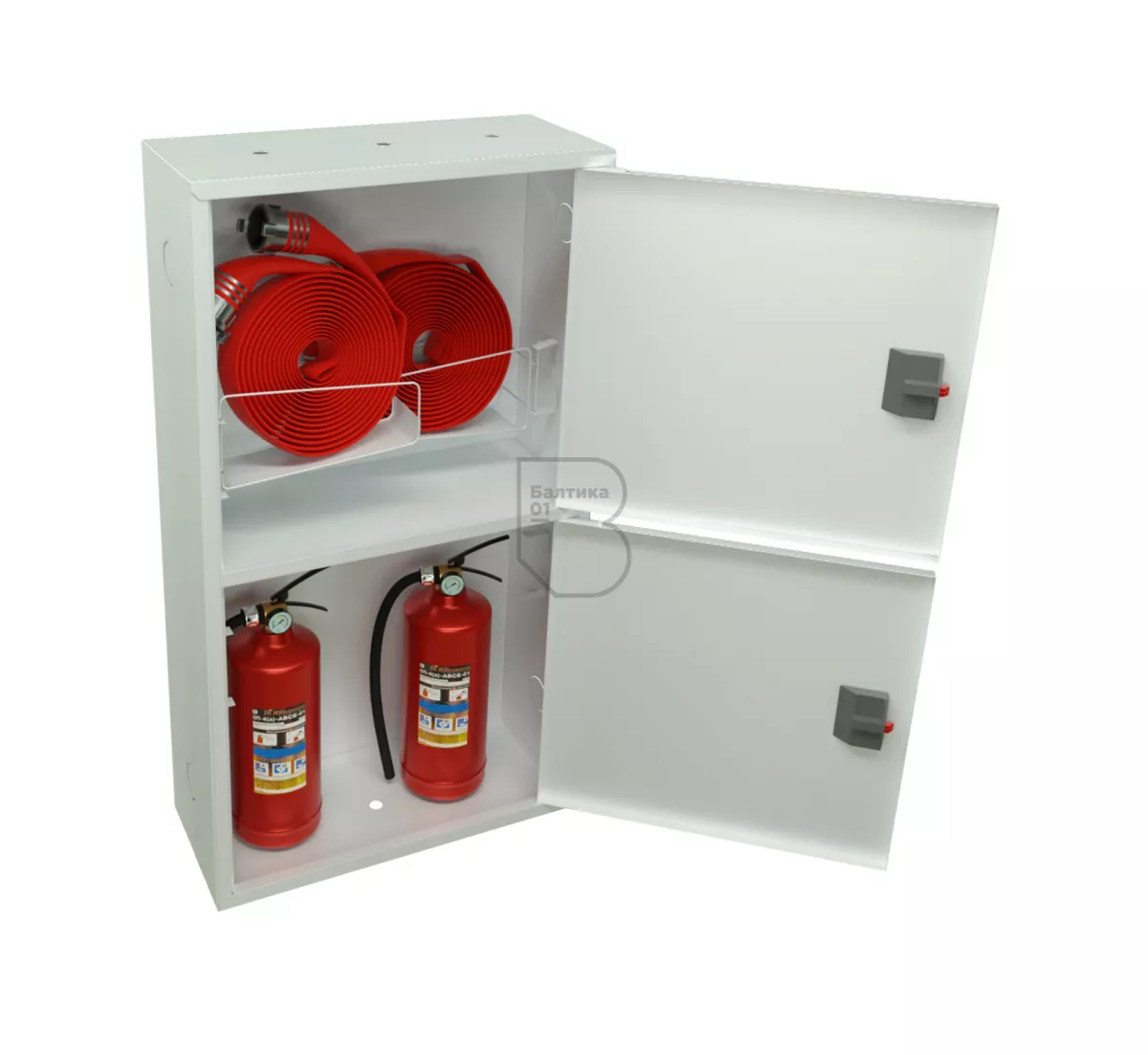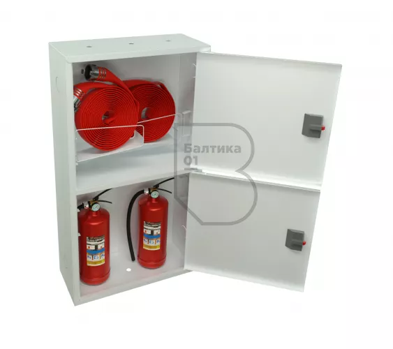 Шкаф ШПК-320-12 НЗБ имеет в верхнем отсеке две кассеты (корзины), что позволяет подсоединять два крана с обеих сторон. Нижний отсек предназначен для хранения двух огнетушителей до 10 кг. Дверцы пожарного шкафа открываются на 160 градусов. Имеют запорное устройство в виде пластиковой защелки.